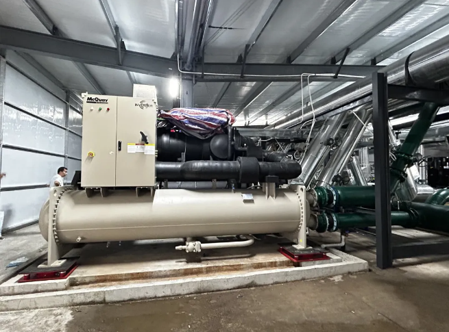 根據(jù)廠房用冷需求,模擬實際用冷量后,我們精選配置了2臺冷量達500RT的麥克維爾冷水機組,以其卓越的制冷性能和能效比(COP≥6.3,IPLV≥9.6),為整個工廠提供了充足的冷源。同時,高效的冷凍泵與冷卻泵加裝變頻器,以及在冷卻塔上加裝我司的專利產(chǎn)品水力平衡器,共同構成了高效穩(wěn)定的冷源系統(tǒng)。