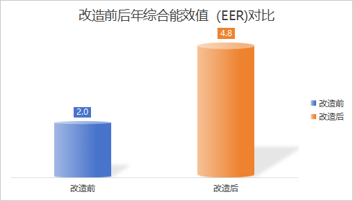 改造成果:節(jié)能率55%;相較于傳統(tǒng)機房(EER<3.0),改造后年綜合能效(EER)達到4.8