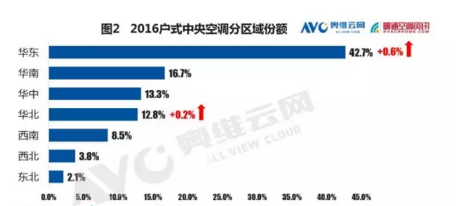 華東區(qū)域一直是國(guó)內(nèi)戶(hù)式中央空調(diào)第一大市場(chǎng),2016年占比達(dá)到42.7%,同比提升0.6個(gè)百分點(diǎn),規(guī)模超過(guò)115億元,相當(dāng)于華南、華中、華北三個(gè)區(qū)域的總和??傮w來(lái)看,七大區(qū)域的市場(chǎng)份額在2016年并未發(fā)生太大變化,基本保持穩(wěn)定。華東、華南市場(chǎng)中,房地產(chǎn)精裝修市場(chǎng)的繁榮進(jìn)一步拉動(dòng)了戶(hù)式中央空調(diào)的發(fā)展;華中、華北地區(qū)“精裝修”“煤改電”等政策的落實(shí),發(fā)展?jié)摿Σ豢尚∮U;中西部地區(qū)受到一帶一路的資金扶持,增長(zhǎng)空間值得期待;東北地區(qū)的連續(xù)高溫、以及振興東北老工業(yè)基地的政策,也帶來(lái)一點(diǎn)的增量需求。