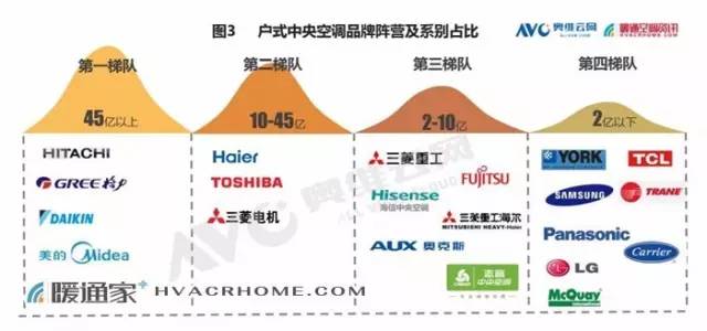 2016年,戶(hù)式中央空調(diào)市場(chǎng)四大品牌陣營(yíng)中,日立、格力、大金、美的穩(wěn)居第一梯隊(duì),銷(xiāo)售規(guī)模均在45億元以上;海爾、東芝、三菱電機(jī)銷(xiāo)售規(guī)模在10億到45億元之間,屬于第二梯隊(duì);第三梯隊(duì)包括三菱重工、海信、奧克斯、富士通、三菱重工海爾、志高,銷(xiāo)售規(guī)模在2-10億元之間;約克、TCL、三星、特靈、松下、LG、開(kāi)利、麥克維爾銷(xiāo)售規(guī)模均在2億元以下,屬于第四梯隊(duì)。分系別看,國(guó)產(chǎn)系和日韓系平分秋色,令歐美系品牌望其項(xiàng)背。當(dāng)然,這與國(guó)產(chǎn)系、日韓系與歐美系所走的技術(shù)路線不同有著莫大的關(guān)系。