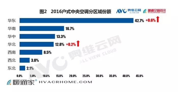 華東區(qū)域一直是國(guó)內(nèi)戶(hù)式中央空調(diào)第一大市場(chǎng),2016年占比達(dá)到42.7%,同比提升0.6個(gè)百分點(diǎn),規(guī)模超過(guò)115億元,相當(dāng)于華南、華中、華北三個(gè)區(qū)域的總和??傮w來(lái)看,七大區(qū)域的市場(chǎng)份額在2016年并未發(fā)生太大變化,基本保持穩(wěn)定。華東、華南市場(chǎng)中,房地產(chǎn)精裝修市場(chǎng)的繁榮進(jìn)一步拉動(dòng)了戶(hù)式中央空調(diào)的發(fā)展;華中、華北地區(qū)“精裝修”“煤改電”等政策的落實(shí),發(fā)展?jié)摿Σ豢尚∮U;中西部地區(qū)受到一帶一路的資金扶持,增長(zhǎng)空間值得期待;東北地區(qū)的連續(xù)高溫、以及振興東北老工業(yè)基地的政策,也帶來(lái)一點(diǎn)的增量需求。